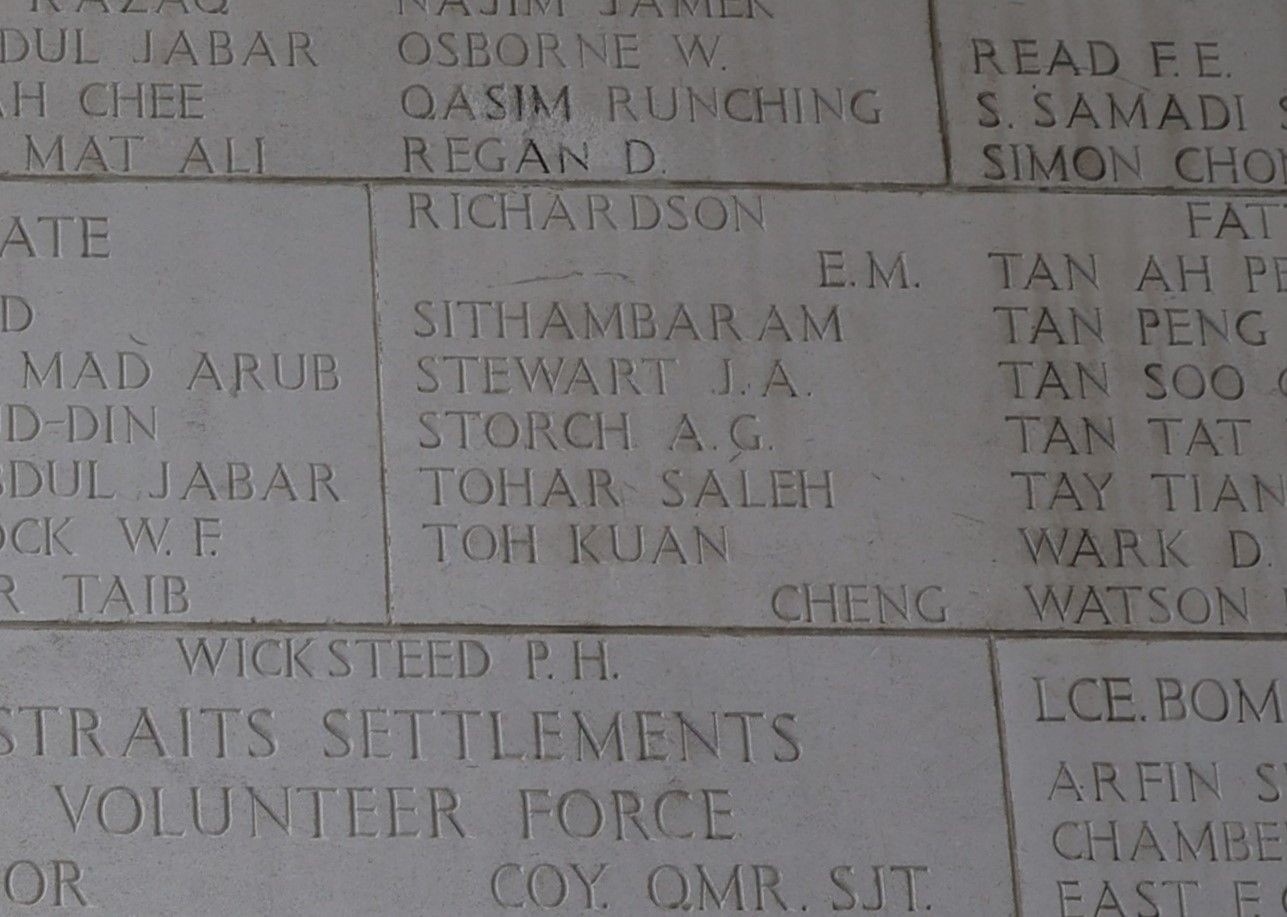 Federated Malay States Voluntary Force. POW in Changi and Kuching camps. Died in Labuan (Borneo) camp, where there were no survivors. Buried at Singapore Cemetery.