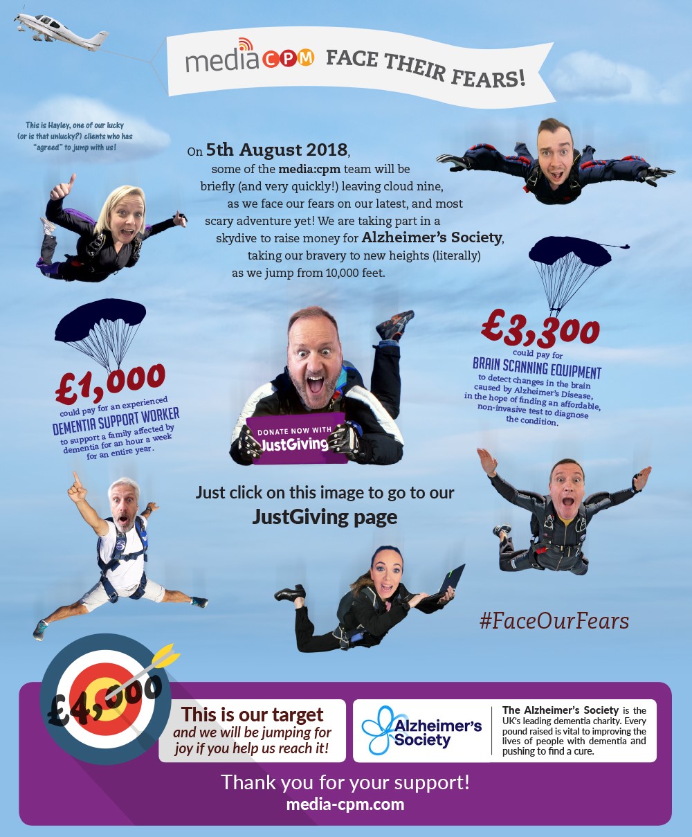 On Sunday, 5th August, for the very first time, Ted and media:cpm team will be taking part in a skydive to raise money for Alzheimer’s Society, in doing so taking their bravery to new heights (literally) as they jump from 10,000 feet! Ted mentioned that they “are all doing it for a number of reasons, but above all else because we all know someone that has been directly affected by this awful disease and, despite us all being terrified, believe they are an incredible cause.”